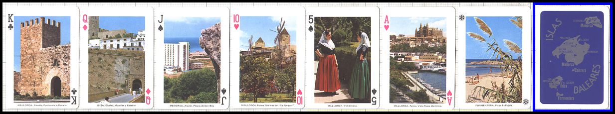 A photographic souvenir pack with 54 different views in colour. French suits. Backs: map of Balearic Islands in silver on dark blue.