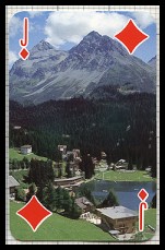 Photographic souvenir pack with 55 different named colour photographs of Switzerland. No borders, so suit-signs and indices are superimposed on views. Backs: arms of the cantons (only available in blue).