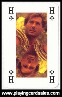 Advertising pack for Caballero cigarettes showing shots from one of their advertising campaigns. On all four suits, cigarettes replace pips on numeral cards (2's to 10's), with the appropriate number of cigarettes on each card.